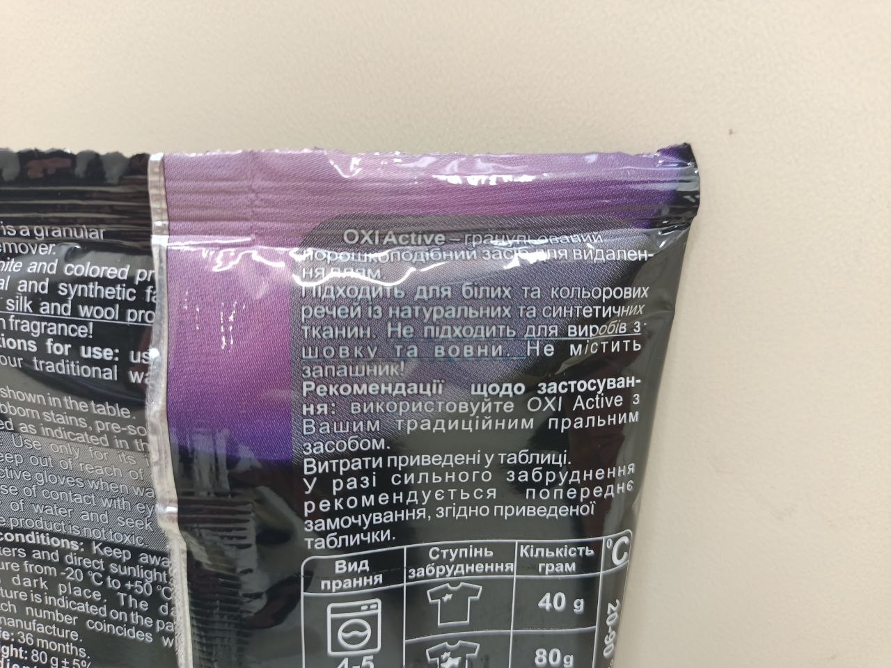 Засіб застосування: використовуйте 40-80г плямовивідника з Вашим традиційним пральним засобом. У разі сильного забруднення рекомендується попереднє замочування.